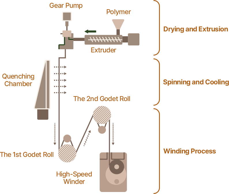 The masterbatch is melt-spun into continuous filament. At this stage, GREEVO’s functions—such as thermal conductivity, antibacterial performance, and deodorizing effect—are embedded into the fiber.