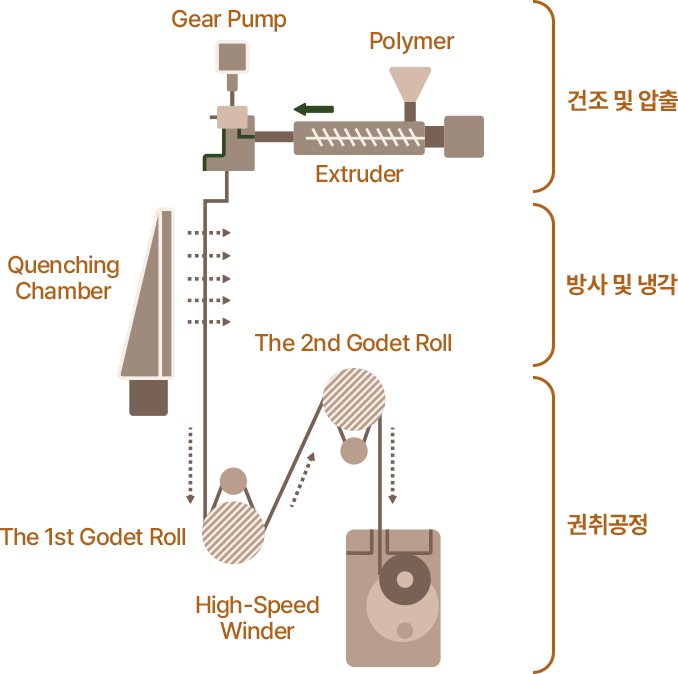 마스터배치를 용융 방사하여 연속사 필라멘트로 제작합니다. 이 단계에서 항균, 소취 등 GREEVO만의 기능이 섬유에 내재됩니다.
